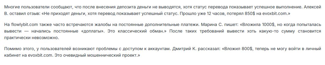 Отзывы о EvoxBit в сети в основном отрицательные. В них повторяется одна и та же жалоба – Evox Bit не выводит деньги.