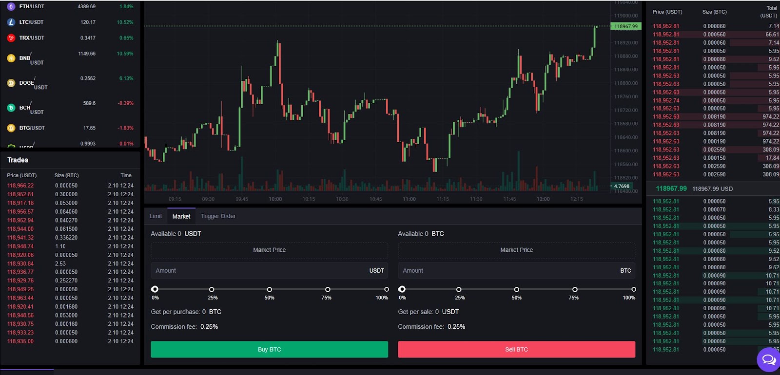 • лента сделок и форма ордеров (Limit, Market, Trigger Order);