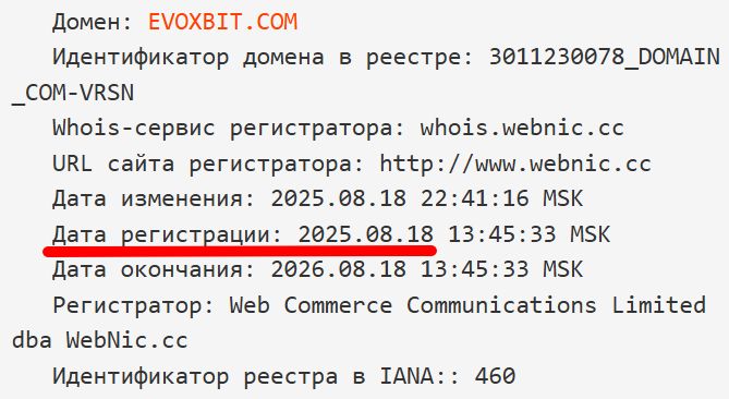 При изучении информации о Evox Bit выяснилось, что домен evoxbit com был зарегистрирован только 18 августа 2025 года.