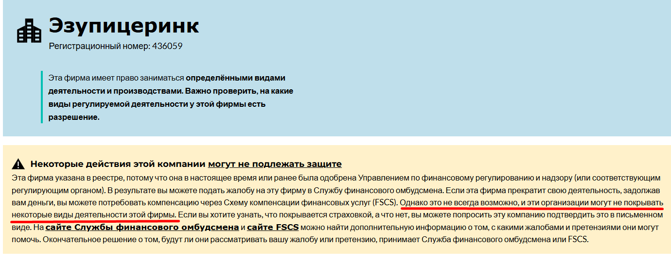 На сайте одного из регуляторов компании прямо указано, что наличие регистрации компании не гарантирует пользователям покрытие убытков в случае финансовых споров. Претензию могут отклонить или вообще отказаться рассматривать. При этом даже конкретные виды деятельности фирмы остаются в тумане размытых формулировок регулятора.