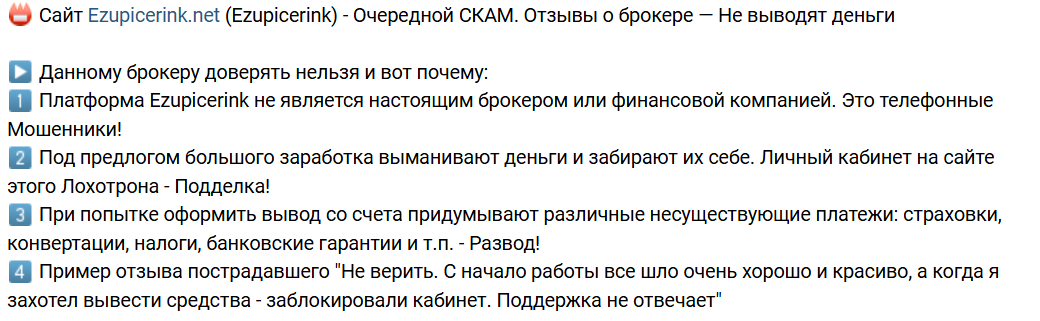 Наиболее полную картину деятельности брокера Ezupicerink net дают отзывы. В откликах пользователи описывают проект как “очередной клон, обдирающий новичков”. Перед началом сотрудничества с клиентов пытаются вытрясти транзакции за некую страховку, об обязательной оплате которой на сервисе нет ни единого упоминания. Другой сценарий работы – за созданием заявки на вывод средств непременно следует блокировка профиля и счета.