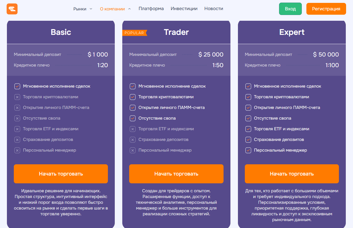Для работы доступно три тарифа – сумма минимальной инвестиции составляет 1000 долларов. При этом клиенту на тарифе Basic недоступна масса опций, в том числе помощь персонального менеджера. Весь спектр услуг можно получить только вложив от 50 000 долларов.