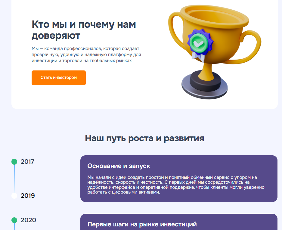 Раздел О компании представляет “исчерпывающую” информацию о руководителях проекта – команда работает полностью анонимно, не представлен ни один эксперт из “премиального” саппорта. Разработчики указывают, что запуск платформы состоялся в 2017 году. Доменное имя действительно зарегистрировано в данный период, однако данные из веб-архива отсутствуют. Нет никаких доказательств, что сайт все это время действительно работал.