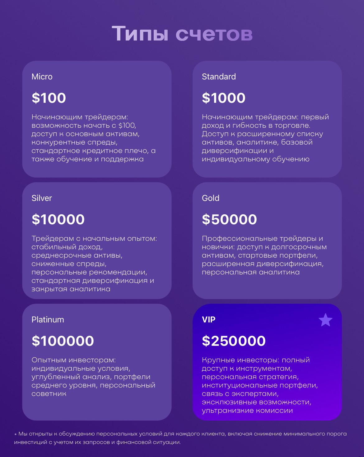От суммы вложений зависят доступные привилегии. Вот какие типы счетов предлагают владельцы:- $100 — Микро;