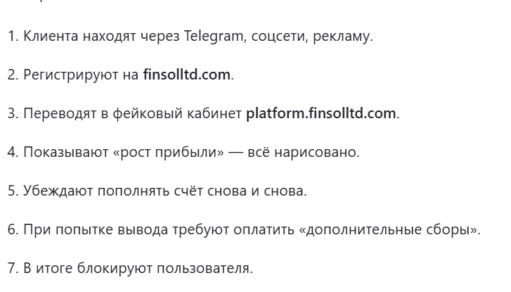- Пользователи пишут, что потеряли средства, да еще плюс у них требовали дополнительные платежи, а это говорит о высоких финансовых рисках при сотрудничестве с платформой FinsolLtd com.
