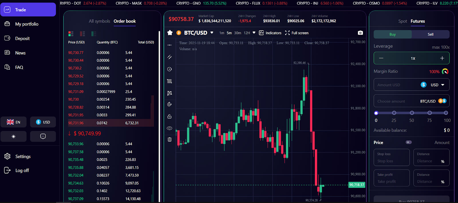 Максимальное кредитное плечо составляет 100X, а также можно добавить тейк-профит и стоп-лосс, причем переключаться между спотовым и фьючерсами можно нажатием одной кнопки. Демо-счет отсутствует, поэтому протестировать работу нельзя и торговать без внесения средств не получится.
