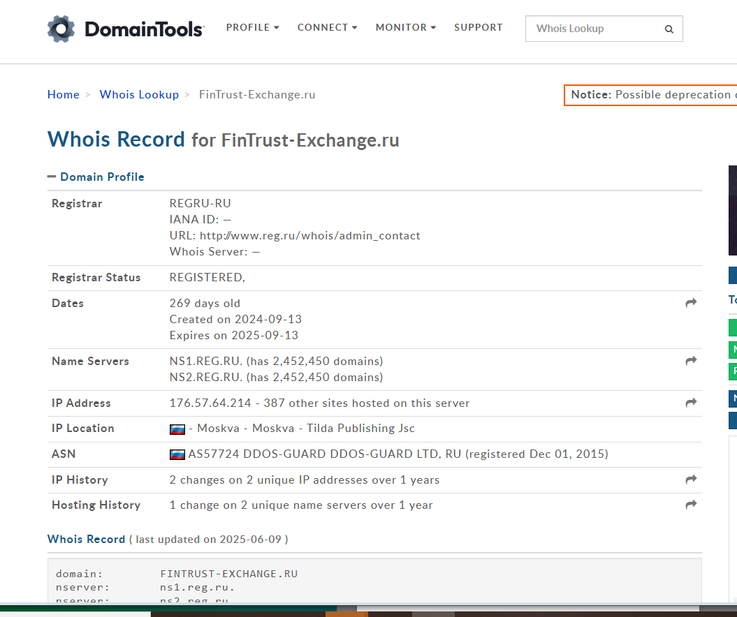 Анализ домена FinTrust-Exchange.ru дает немало интересных зацепок. Сам домен молодой и по состоянию на 9 июня 2025 г. ему нет и года. Был зарегистрирован 13 сентября 2024 г. и потому “тысяча перестановок за 2 года” — уже не правда.Сервер находится в Москве, а в качестве хостинг-провайдера значится Tilda Publishing JSC — сайт собран на конструкторе Tilda, что удобно для быстрого запуска, но вряд ли говорит о серьезной финансовой инфраструктуре.