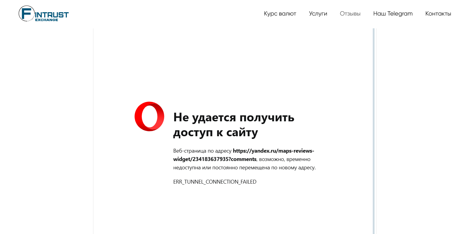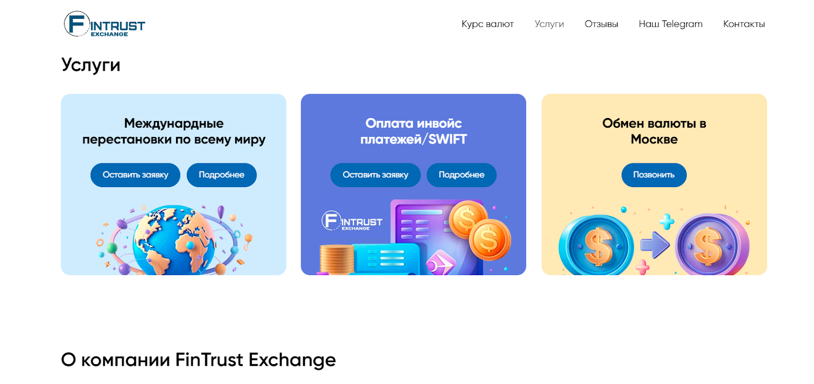 Заявленный режим работы обмена валюты Fintrust — с 9 утра до 11 вечера без выходных, но вся коммуникация идет через ТГ. На сайте присутствуют громкие заявления о безопасности, клиентоориентированности и даже “международных перестановках”.