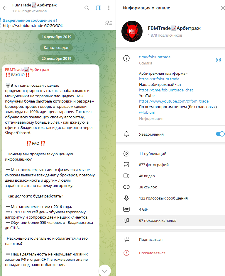 Канал ведется с 2019 года, при этом все посты были посвящены проекту ФБМ Трейд. Примечательно, что изначально проект был посвящен заработку на бинарных опционах. Александр предлагал за плату обучать работе с брокерами БО. Это – весьма сомнительное направление, оно ближе к ставкам, нежели к реальной торговле. Бинарные опционы даже называют беттинговыми как раз из-за высоких рисков и формата, при котором трейдеру фактически приходится играть против брокера.
