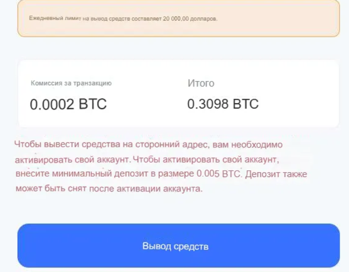 На официальном сайте брокера Folex Pro можно узнать, что минимальный платежный счет нужно пополнить на сумму 0.005 биткоина, чтобы активировать аккаунт. Это сумма в размере примерно ₽42,000 на ноябрь 2025 года. Ежедневный лимит на вывод средств составляет $20,000, а комиссия на транзакцию накладывается в размере 0.0002 биткоина. Это около ₽1,700 или $21. Депозит обязателен для активации аккаунта и говорится, что после перевода его можно будет снять.