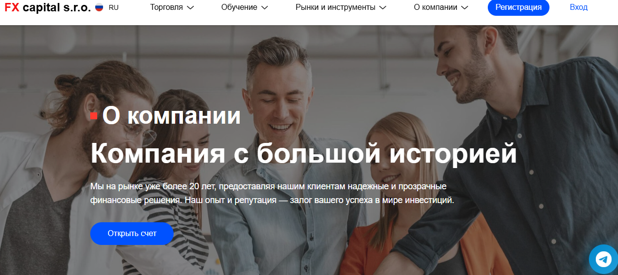 Компания Fx Capital Sro утверждает, что работает более 20 лет на финансовом рынке. Она якобы обслуживает более 750 тыс клиентов, которым предлагает лучшие возможности для торговли. Да, это довольно смелые заявления, учитывая, что на ее официальном сайте Fx Capital Sro нет никаких подтверждений данной информации.