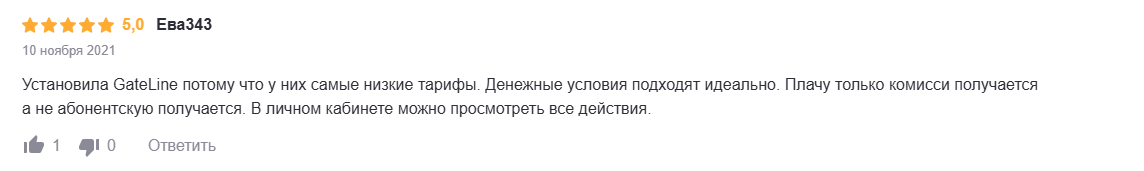 Один из клиентов пишет, что в мире есть не так много платежных систем, а особенно для бизнеса и ранее он использовал WebMoney, но переводы задерживались. Пользователь пишет, что система «ГейтЛайн» гораздо более удобная, так как платежи моментальные, а также она хорошо адаптирована под бизнес.Клиент с ником «Ева343» в своем отзыве на GateLine рассказывает, что установила такую платежную систему, так как у нее самые низкие тарифы. Более того, ей идеально подходят денежные условия и она платит только комиссию, а не абонентскую плату, вероятно, из-за выгодных условий и программы лояльности.