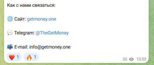Кроме своего официального сайта у платформы есть канал в Телеграмм, где обменник Get Money собрал всего 15 подписчиков. Новостной канал не очень активен и новые публикации от авторов обменника в нем появляются редко.