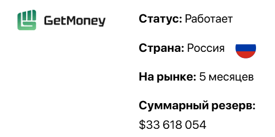 Обменник «ГетМани» зарегистрирован в России и сообщается о том, что суммарный резерв обменника составляет более $33,600,000. Работает проект менее полугода, а точного адреса, по которому зарегистрирована организация в РФ не уточняется.