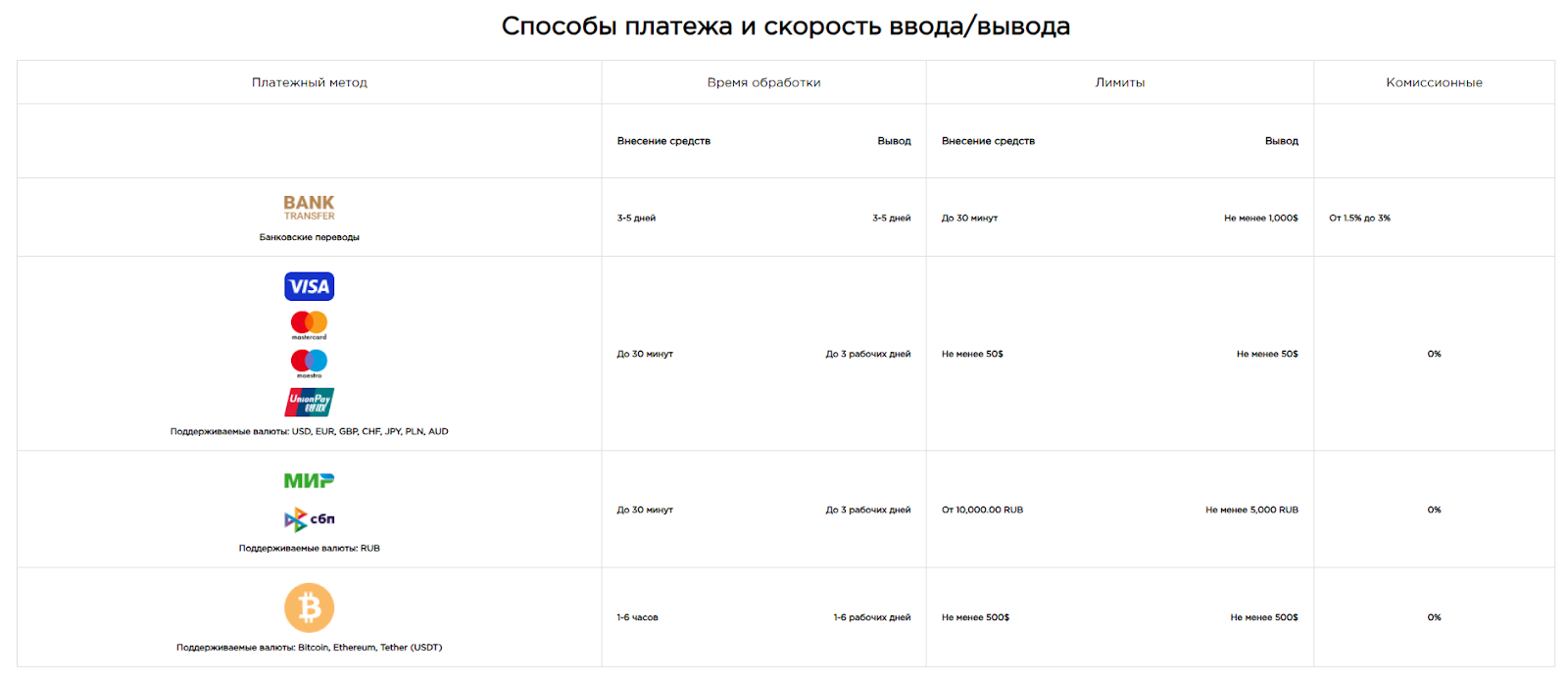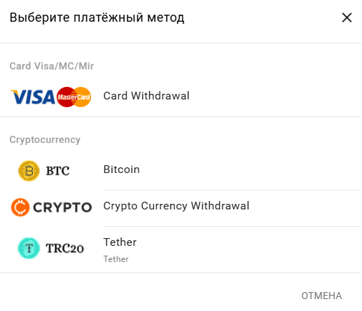 Запросить вывод можно только на карту или в криптовалюте, вопреки описанию на одной из страниц основного сайта. Подобное указывает на некорректное предоставление информации, часто так случается, если пользователям изначально не планируют ничего выплачивать.Если верить описанию, деньги должны поступить в срок от 3 до 6 рабочих дней, комиссию за это никакую не взимают. Минимальная сумма для платежа зависит от способа перевода – для криптовалюты установлено ограничение в $500, а для международных карт от $50.