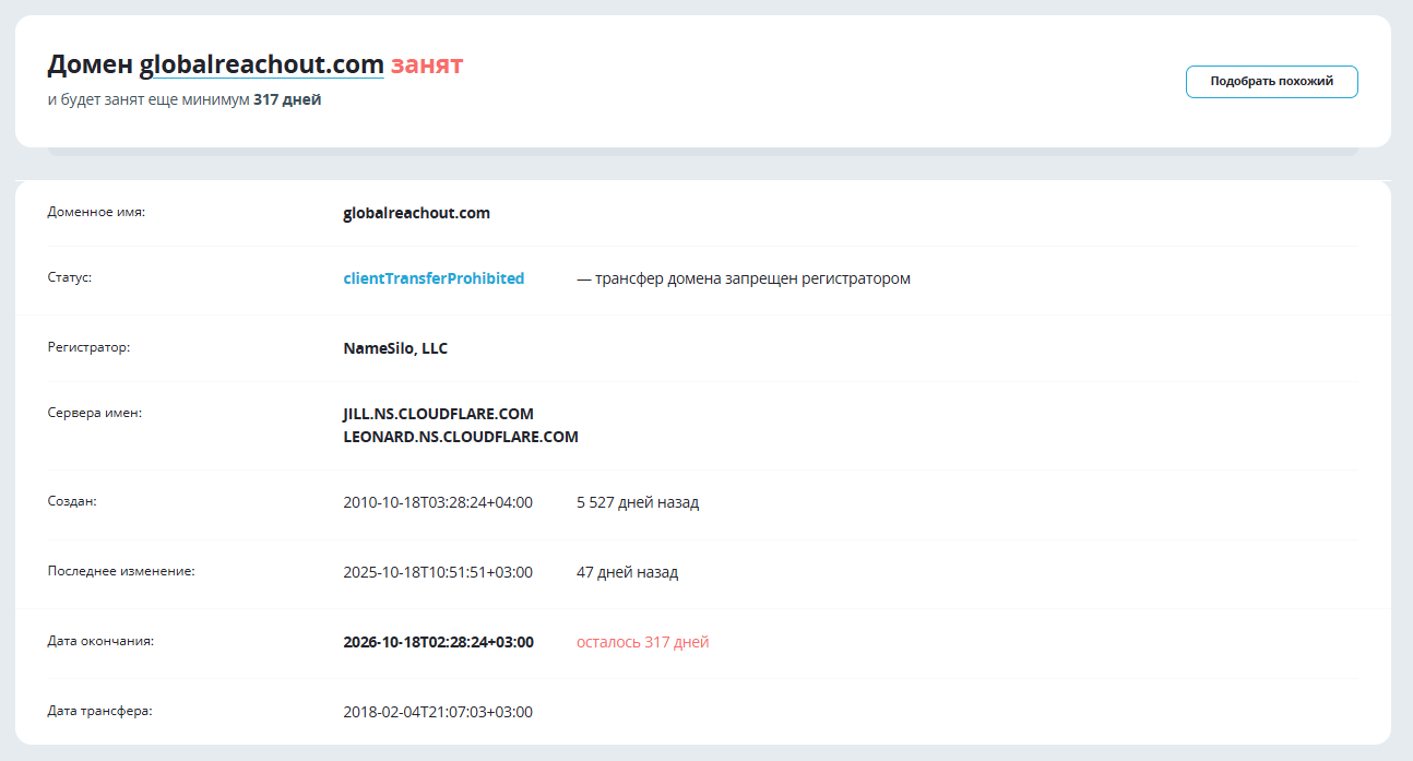 Если проверить домен, то можно заметить, что он был получен в 2010 году – это могло бы указывать на долгое присутствие брокера на рынке, но все не так просто. До 2024 года этот адрес использовался разными компаниями и находился на продаже, к рассматриваемой финансовой платформе он имеет отношение только с конца 2025 года.