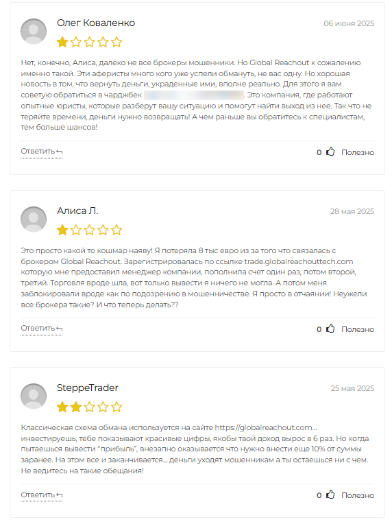 Такие отзывы о Global Reachout com проливают свет на возможный обман и мошенничество, поэтому сотрудничать с подобным проектом может быть крайне опасно. Лучше проигнорировать рекламу брокера, поскольку инвестирование через фейковые платформы приводит к потере средств.