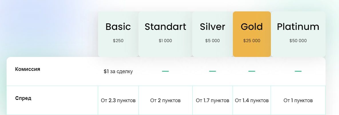 • Gold обойдется в $25 000. В этом тарифе меняется кэшбек на 50%, спред минимизируется до 1,4 пункта;