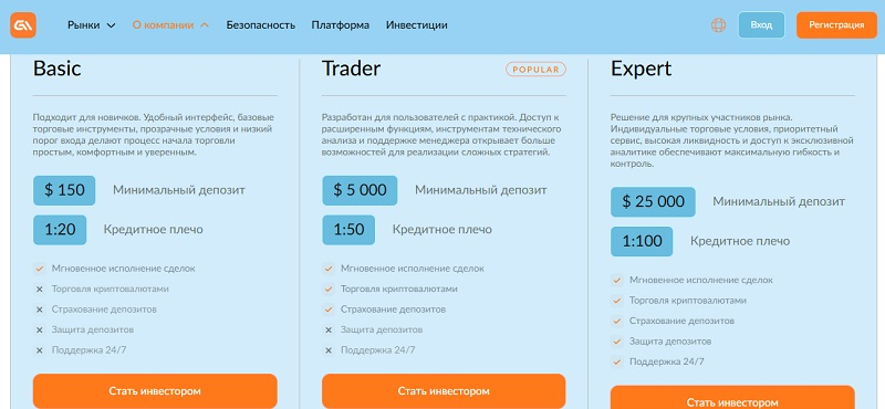 - Счет Expert начинается от $25 000, плечо поднимается до 1:100. Обещается персональная поддержка круглые сутки и «страхование депозита».