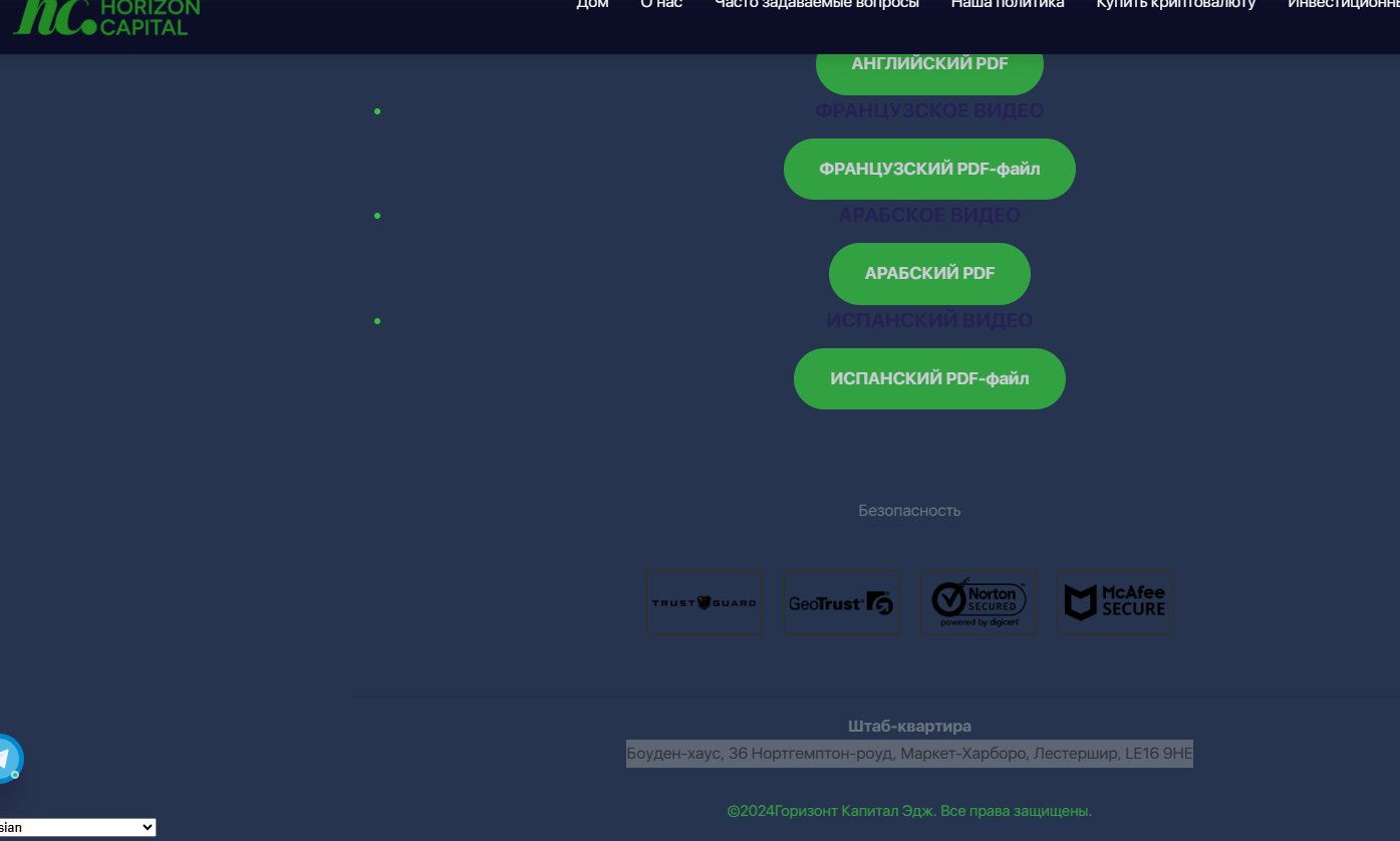 Инвестиционная фирма Horizon Capital Edge не сообщает. В какой государственной юрисдикции зарегистрирована. Также неизвестно какой финансовый регулятор осуществляет контроль деятельности компании.При попытке перейти на страницу с юридической информацией сервер выдает ошибку доступа. Адрес офиса инвестиционной платформы, размещенный на сайте, принадлежит офисному корпоративному центру. Но компании Horizon Capital Edge в списках арендаторов офисов не найдено.