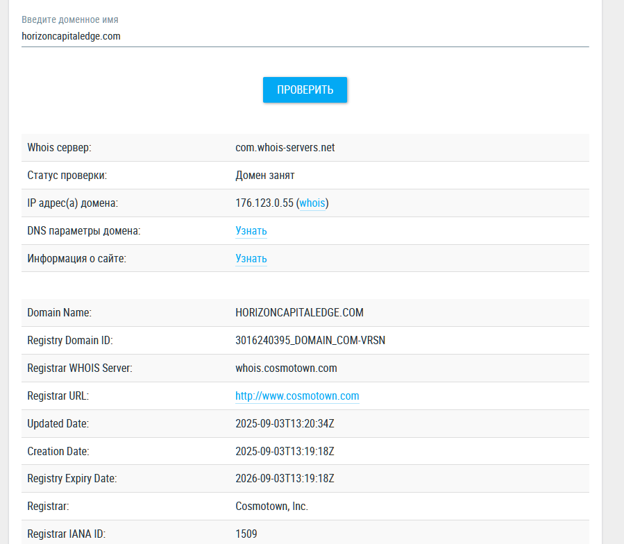 Домен сайта зарегистрирован в сентябре 2025 года, хотя фирма «ХорайзонКапиталЭдж» заявляет, что успешно работает с начала 2024 года и насчитывает более 70 000 довольных инвесторов.