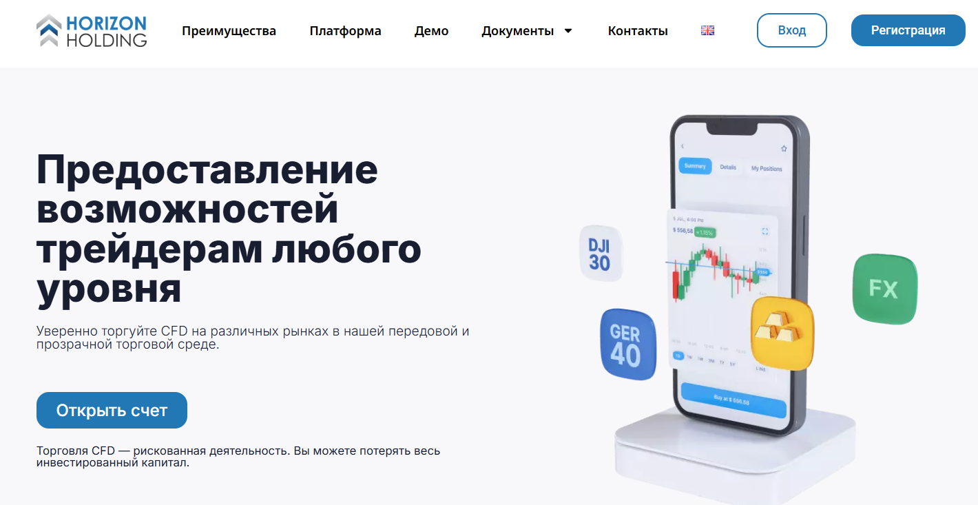 Horizon holding – финансовый посредник без лицензии и регулятора, однако убеждающий потенциальных клиентов в безопасности сделок, персональной поддержки трейдеров и минимальном депозите в 25 долларов. По результатам тщательной проверки площадки наша команда экспертов поделится, какие нюансы стоит учесть, принимая решение о торговле через брокера Хоризон Холдинг.