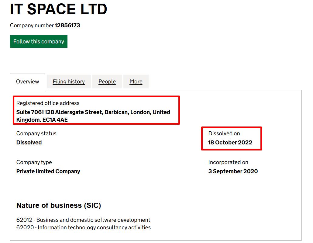 Услуги на платформе Horizon holding якобы предоставляются от компании Investing space LTD, зарегистрированной в Великобритании. Однако номер фирмы не указан. По юридическому адресу в каталогах организаций Туманного Альбиона наша команда нашла соответствующую компанию IT space LTD, которая занималась разработкой софта и консультационными услугами. Директором фирмы являлся украинец Андрей Высочин, а сама компания была ликвидирована в октябре 2022 года. На момент обзора прошло 3 года.