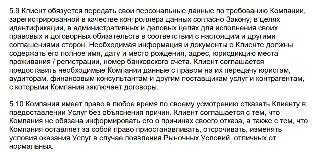 Несуществующая компания наделяет себя всеми полномочиями – может остановить предоставление услуг без объяснения причин и запрашивать любые документы при заморозке счета. Регистрируя личный кабинет, клиент автоматически соглашается на передачу данных третьим лицам: юристам, аудиторам и прочим несуществующим поставщикам услуг в рамках сотрудничества с проектом.