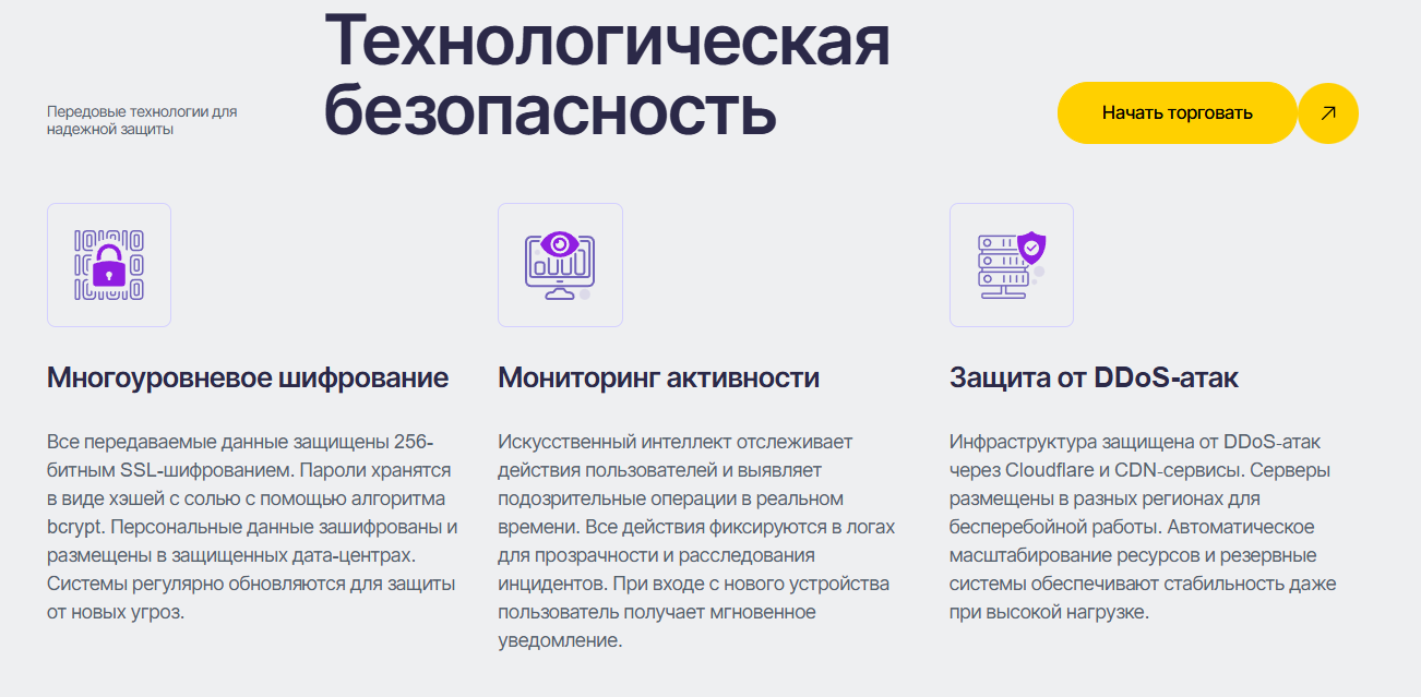 Для защиты персональных данных и денег на депозите пользователям предлагают многоуровневое шифрование, мониторинг подозрительной активности. Разработчики реализовали и защиту от DDoS-атак.