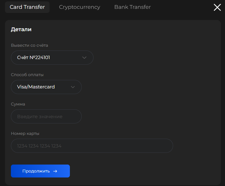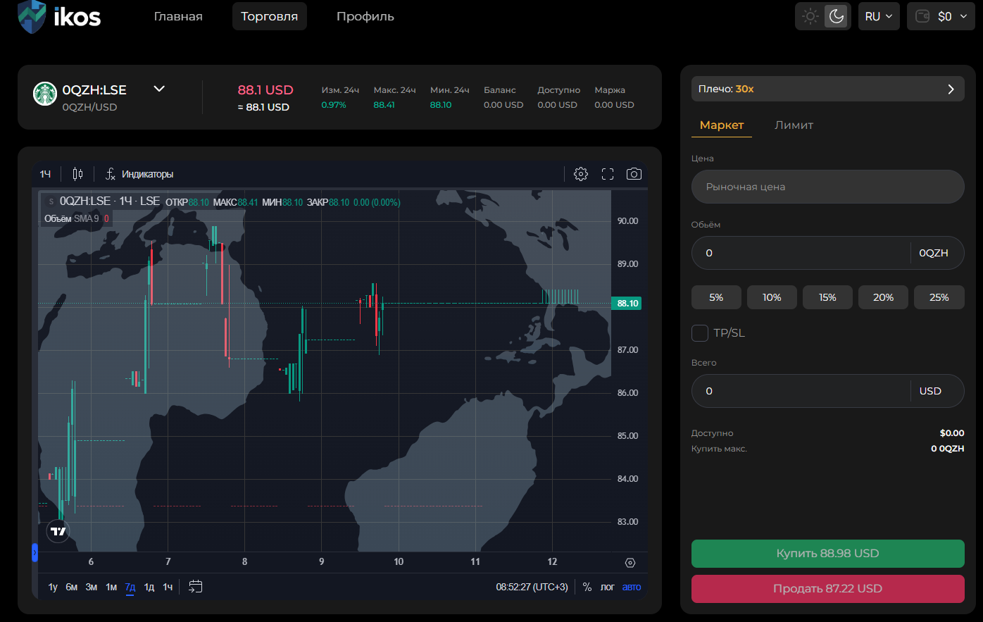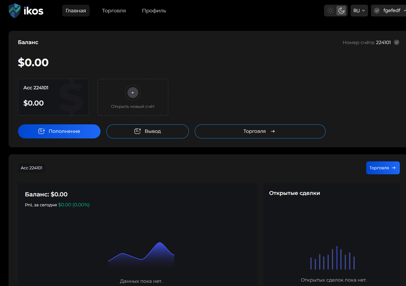 Терминал Ikos cif показывает график цены актива. Справа панель для открытия позиций. Можно выбрать объем сделки и кредитное плечо до 30x. Для пополнения три способа – карты, криптовалюта и банковский перевод. Доступны Visa, Mastercard и МИР.