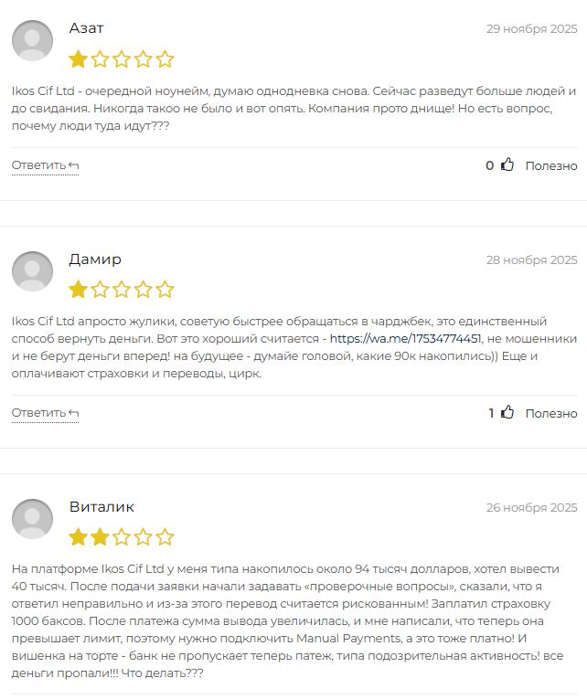 Все отзывы об Ikos Cif Ltd рассказывают один сценарий. Брокер показывает прибыль. Но придумывает препятствия при выводе. Клиенты теряют депозит и дополнительные суммы.