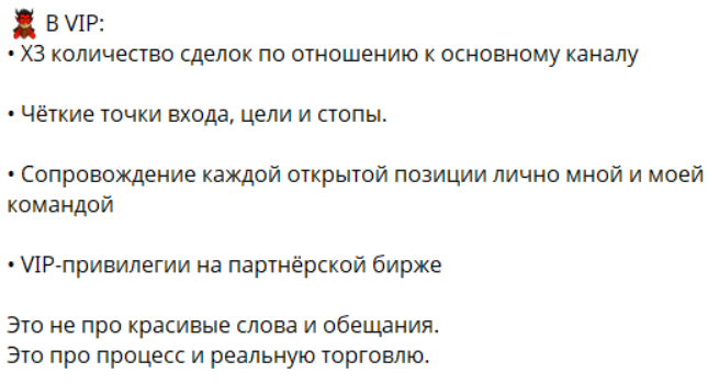 Какая стоимость вступления в закрытый канал с сигналами и обучением от трейдера Inferno Individual не сообщается. Автор говорит, что на vip-канале в три раза больше сделок с четкими точками входа, целями и стопами. Каждую открытую позицию сопровождается лично автор канала и его команда. На партнерской бирже участники канала получают привилегии, однако не сообщается, что именно это за биржа и где автор предлагает заработать на крипте.