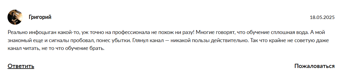 Обучению автора не доверяют и считают, что он не профессиональный трейдер. Советы его не приносят пользы и участники лишь теряют деньги.