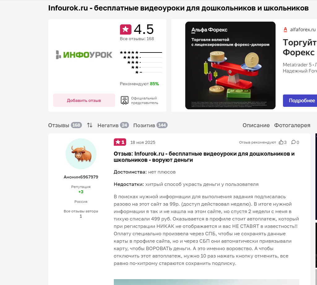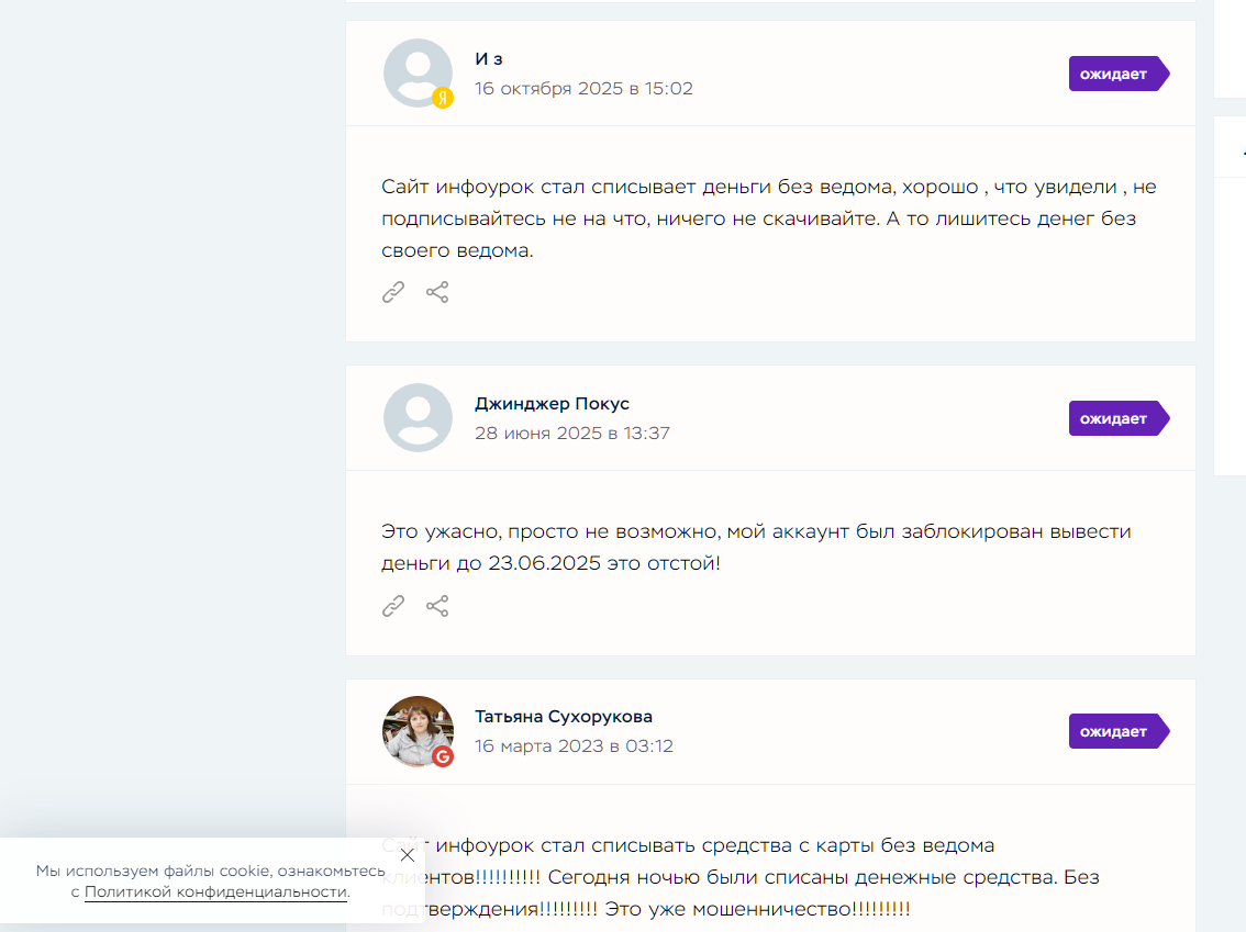 Многие ученики, которые оплатили онлайн тренинги также недовольны их качеством. Клиенты жалуются, что компания Info urok списывает деньги с карты за продление подписки без их ведома.