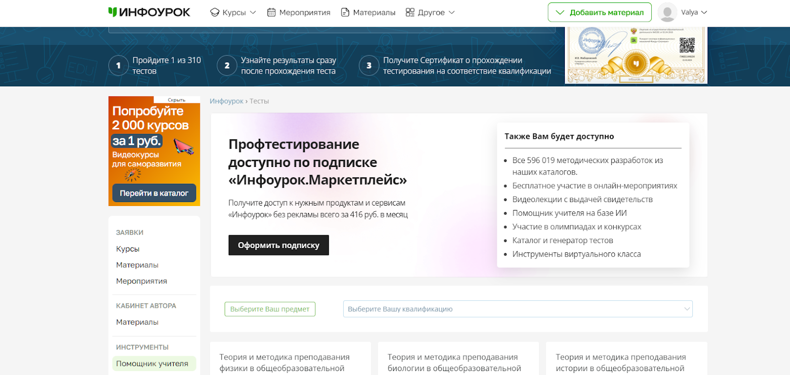 Для того, чтобы пройти профессиональное тестирование и начать размещать свои методические материалы, вести онлайн уроки на платформе, надо оплатить подписку – стоимость 416 рублей. Важно отметить, что эта подписка продлевается автоматически. Значит, получая доход на этом сервисе, работник дополнительно, кроме налогов оплачивает обязательный сбор сервису.