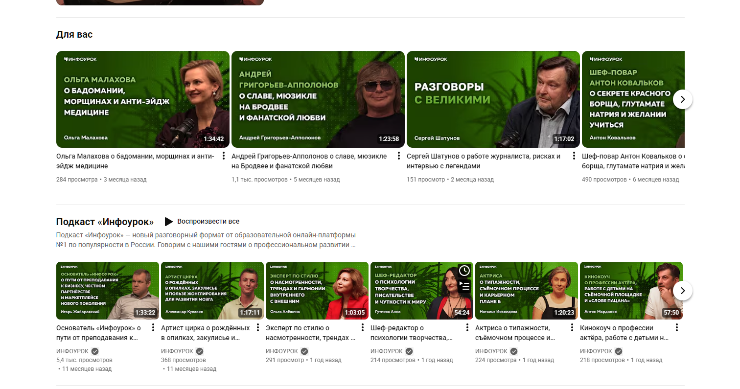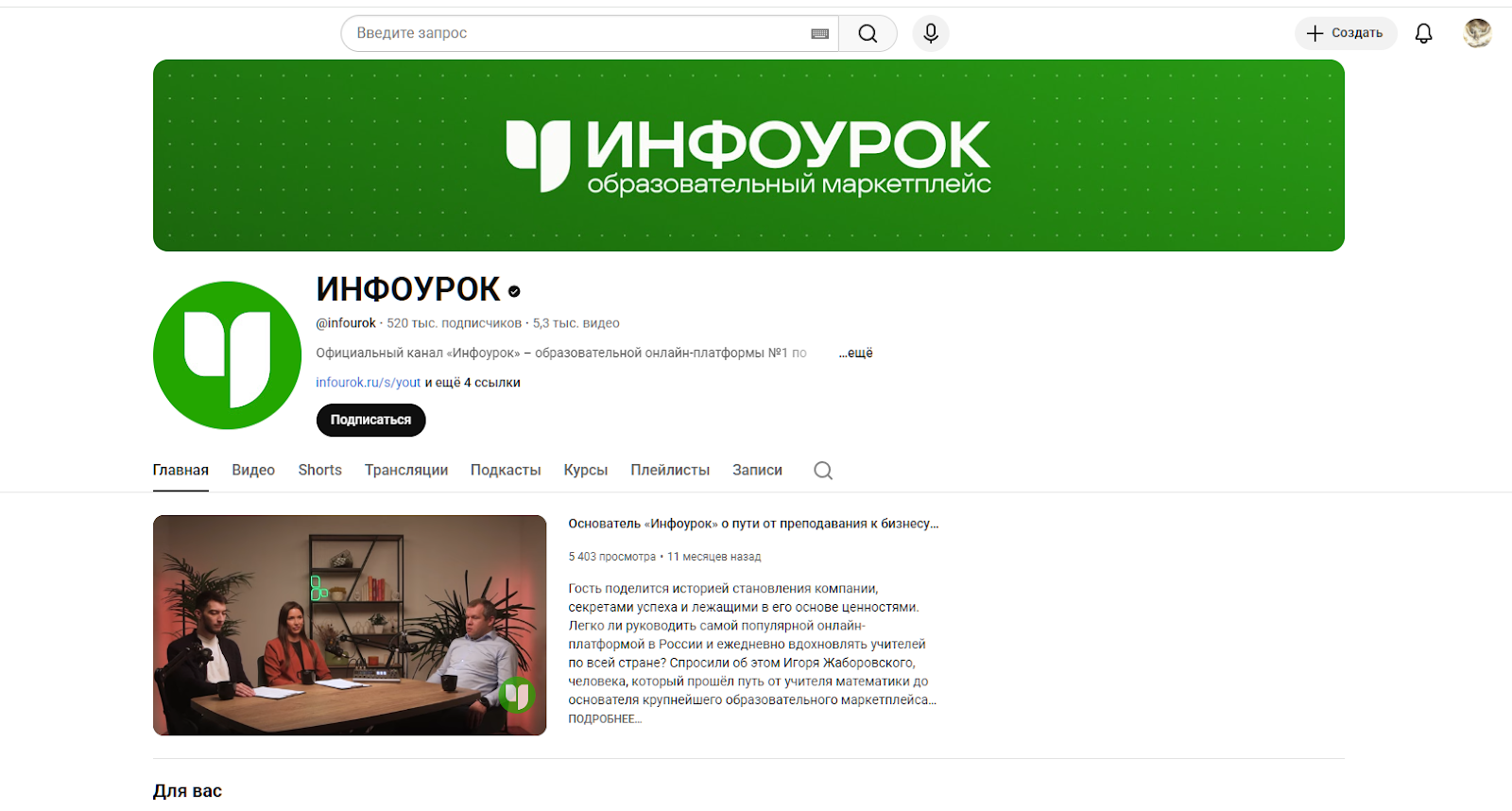На «Ютуб» платформа имеет 520 000 подписчиков. Но максимальное количество просмотров роликов не более 1 000, что говорит о низком качестве видео материалов и небольшой активности пользователей. В последнее время платформа «Инфоурок» «Ютуб» инвестиции, обучение трейдингу начала продвигать очень активно.