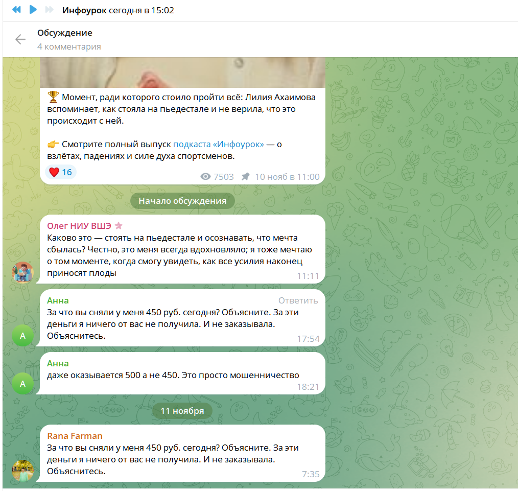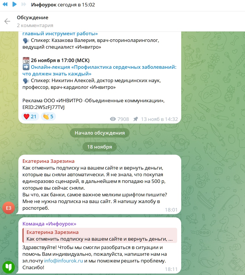 Интересно, что про «Инфоурок» обман Телеграмм подписчики этого сервиса сообщают в комментариях. Пользователи пишут, что не могут отключить автоматическую платную подписку и требуют вернуть деньги.