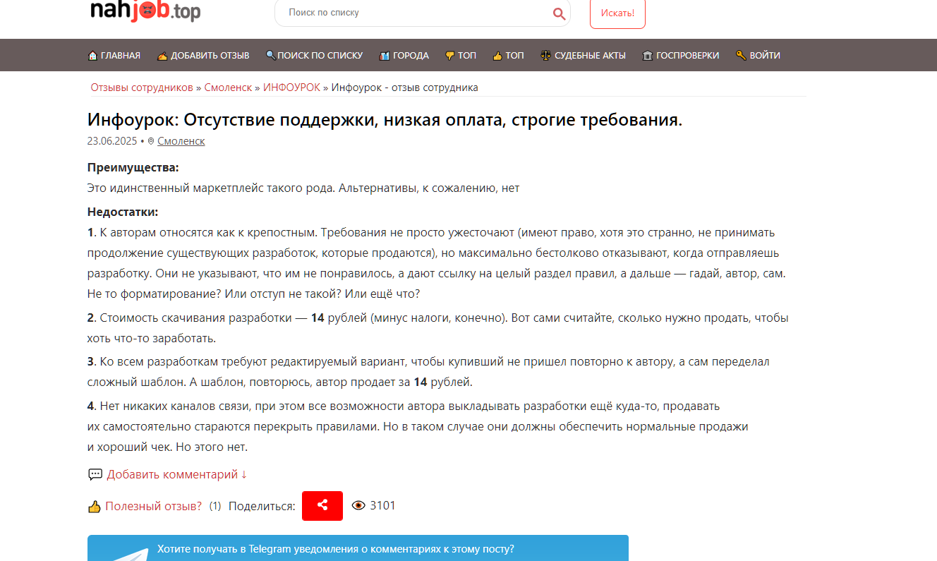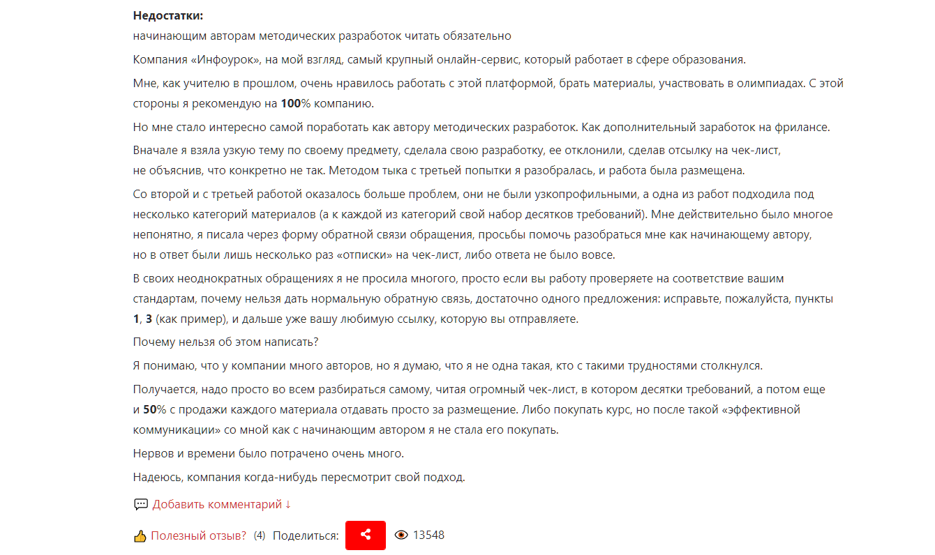 Основная претензия сотрудников к данной платформе – низкая оплата труда. Про сервис «Инфоурок», заработок на публикациях отзывы в основном негативные. Люди недовольные непонятными и жесткими требованиями к размещению материалов, низкой оплатой и отказами в выплатах.