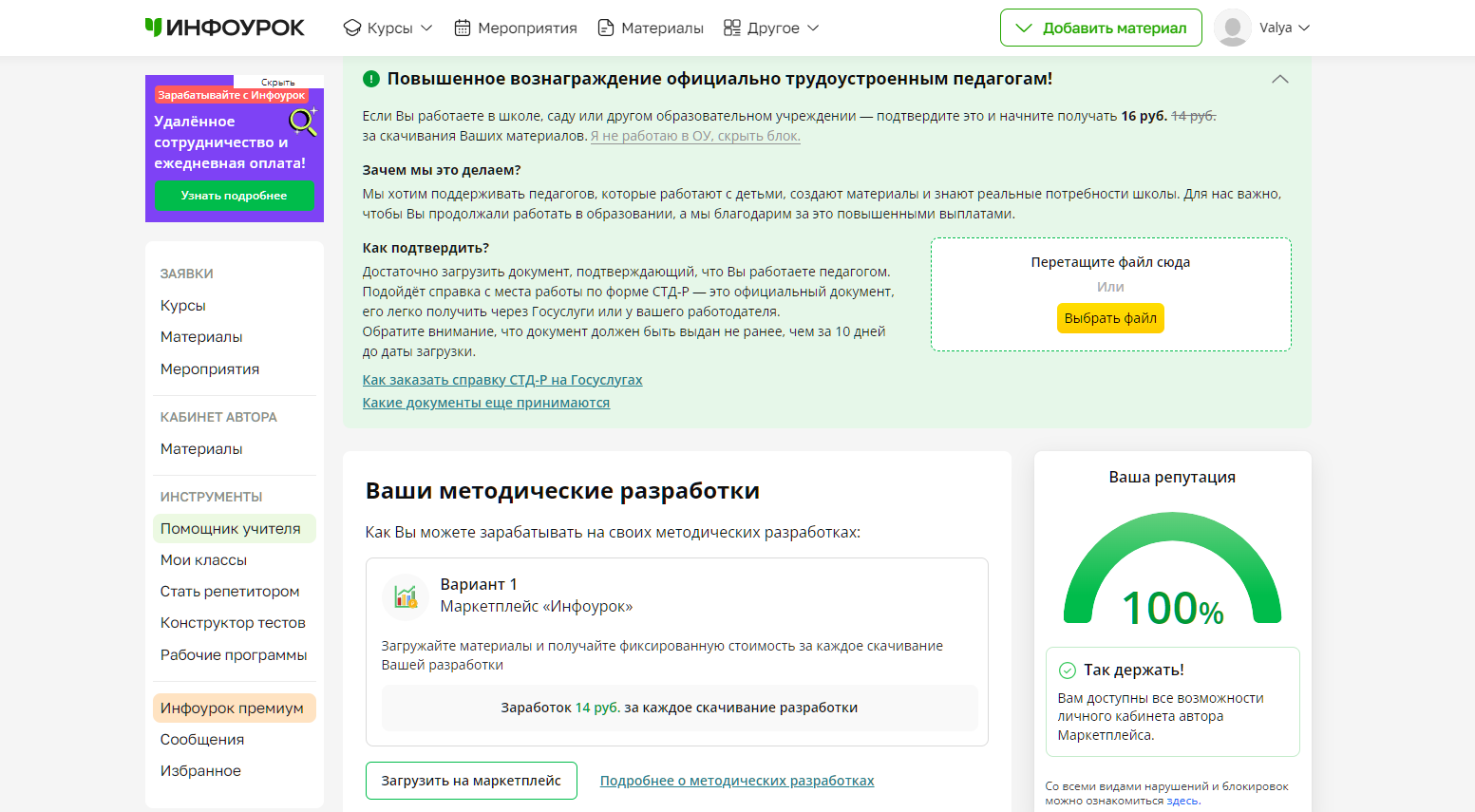 За каждое скачивание курса или методики, тренинга сервис плати 14 рублей. Но для учителей, которые официально работают в школе есть огромная надбавка за скачивания – 2 рубля. Если учесть, что требуется обязательно предоставить данные для налогообложения, то за одно скачивание автор получит рублей 6, не больше.