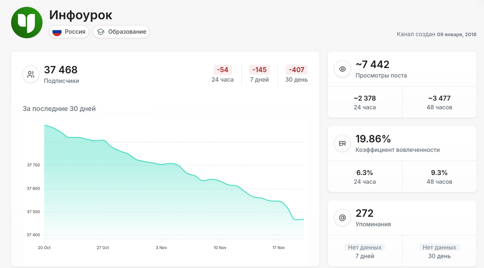 На канал проекта в ТГ подписано 37 468 человек, но активно участвуют в обсуждениях постов только 204 участника проекта. За месяц от канала отписалось 407 человек. По непонятной причине рейтинг канала быстро снижается, хотя вовлеченность подписчиков относительно высокая, почти 20% аудитории.
