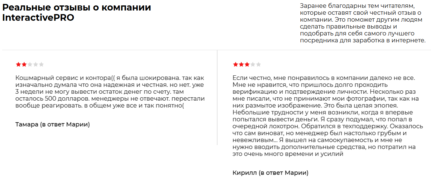 А менеджеры, которые звонят клиентам и предлагают выгодные сделки и инвестиции, как говорят отзывы про interactive pro, редко опираются на реальные аналитические данные. Качественное обслуживание и забота о клиентах – обман. Цель сотрудников службы поддержки – создать видимость прибыльного сотрудничества, чтобы клиент перевел как можно больше средств на их кошельки.