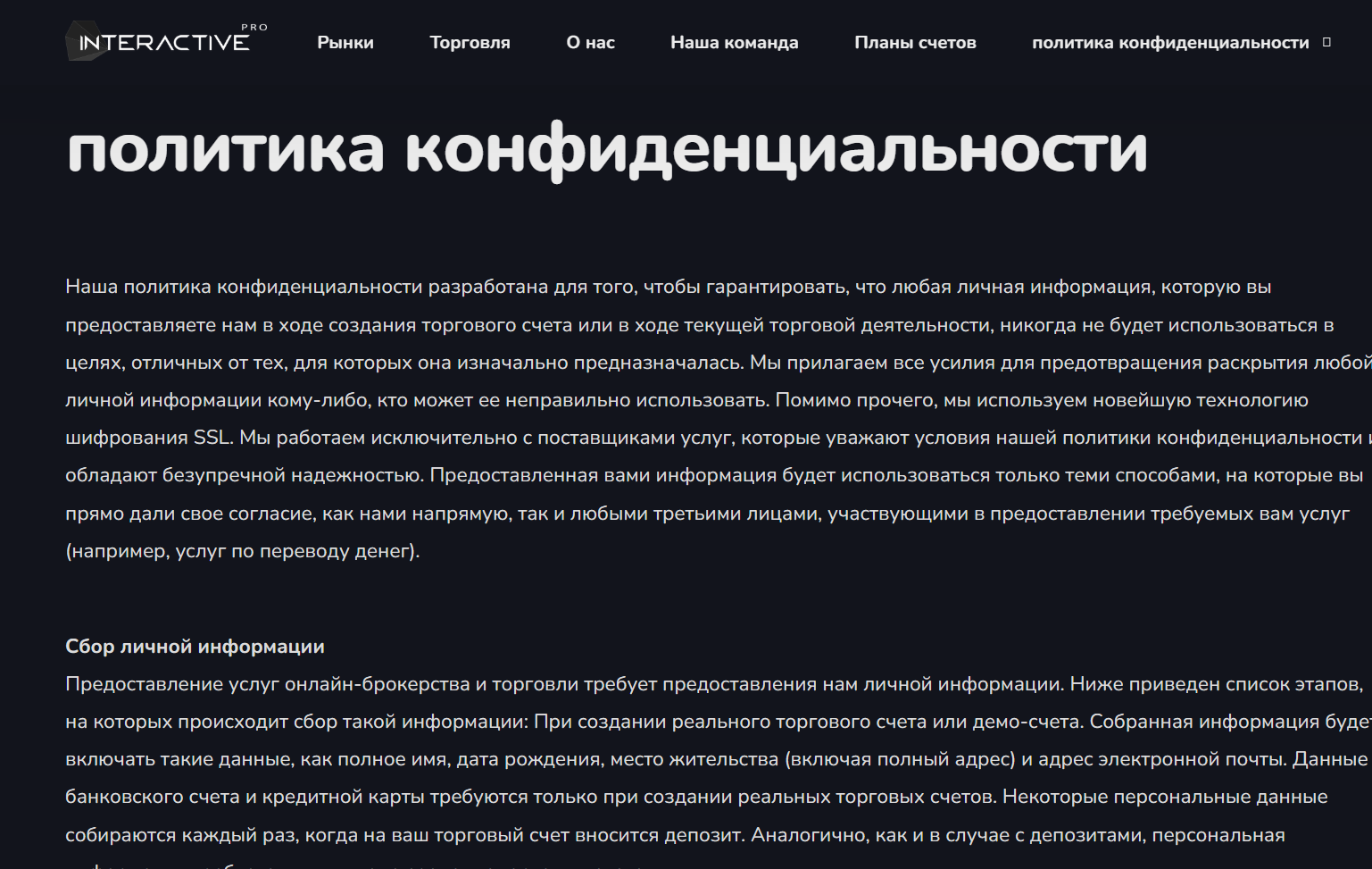 Компания interactive pro явно нелегальная. У нее нет регистрации. На сайте нет сертификата, реквизитов, юридического адреса или другого подтверждения этого. Номер лицензии 483569 от Европейской службой финансовой безопасности не подтвердился. Зато есть KYC: часто мошенничество со сбором персональных данных прячут за борьбой с преступностью и махинациями и подтверждением личности.