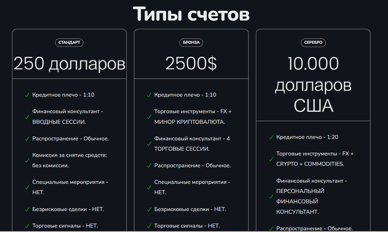 Компания interactive pro предлагает 6 тарифных планов. Депозит: от 250 до 1 млн долларов. Такой разброс смущает, и предложение для фирмы, которая совсем недавно на рынке, слишком смелая. В надежде на серьезную прибыль и выгодные спреды тратить крупные суммы не стоит