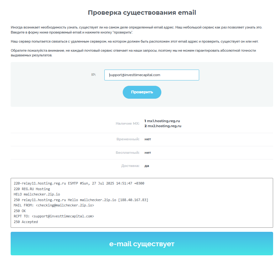 Для связи с саппортом на сайте указана только электронная почта – support investtimecapital com. Адрес рабочий, по нему действительно можно связаться со службой поддержки. Других контактов на сайте мы не нашли. Если необходимо срочно связаться с сотрудниками, можно найти номер в 2Гисе или ЯндексКартах. Вот только график работы службы поддержки на платформе не указан.