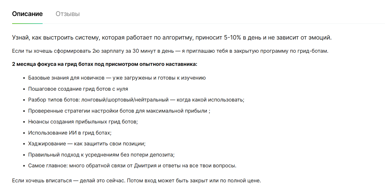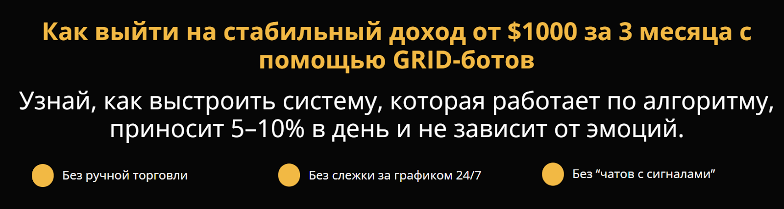 Мы не рекомендуем покупать курс «Как выйти на стабильный доход от 1000 за 3 месяца с помощью Grid-ботов».
