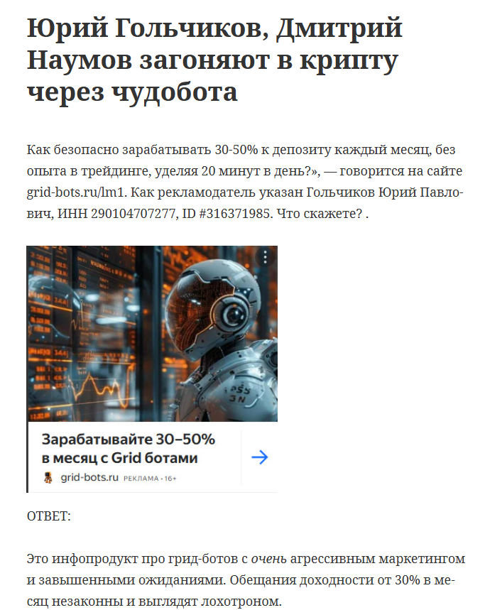 Отзывы о деятельности Юрия Гольчикова и заработке на ГРИД-ботах