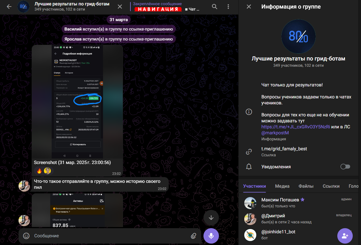 Все тот же бот для покупки курса Юрия Гольчикова про ГРИД-боты предлагает ознакомиться якобы с реальными результатами учеников в отдельном телеграмм-чате. Канал был зарегистрирован 31 марта 2025 года. На 07.12.2025 здесь почти 350 участников. Новые сообщения появляются не каждый день. Участники чата сообщают об эффективности системы и благодарят автора за труд. При этом верифицированную статистику прибыли никто не демонстрирует, а значит, положительные комментарии могут быть фейковыми, а вероятную критику админ может попросту вовремя удалять, чтобы не портить репутацию.
