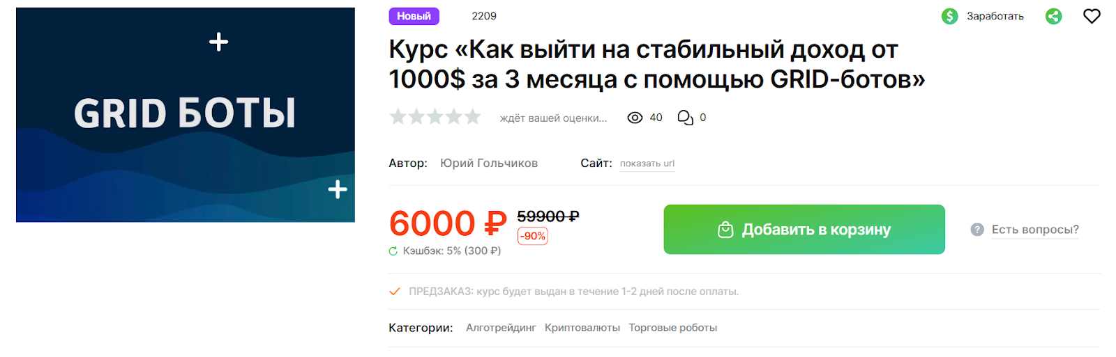 Курс Юрия Гольчикова о ГРИД-ботах можно приобрести и на сторонних сайтах. Например, TraderFond продает обучение за ₽6,000 – со скидкой 90% на декабрь 2025 года.