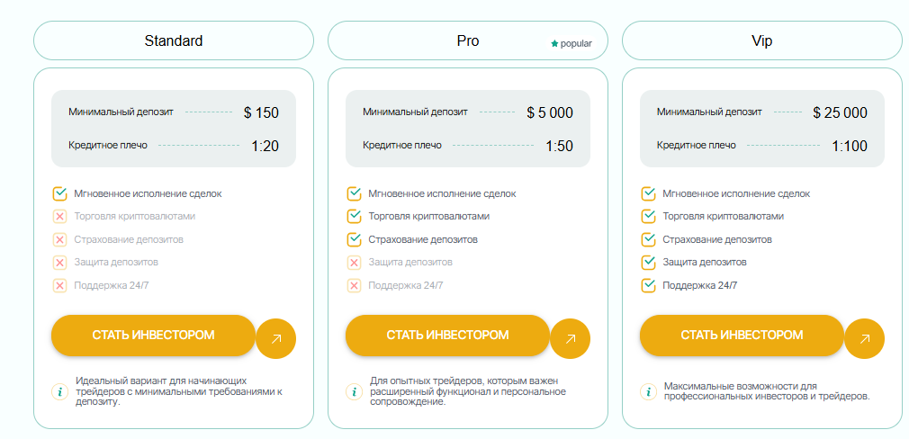 Кроме того, заявлено партнерство с известными поставщиками ликвидности (JP Morgan Chase, Bank of America, Goldman Sachs, Barclays и др.). Но ни один из этих фактов не подтверждается какими-либо договорами или другими документами. Минимальная сумма для старта 150 долларов, всего есть три тарифа: Стандарт, ПРО и ВИП, кредитное плечо от 1:20 до 1:100.