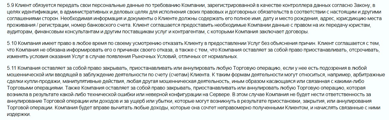 В соглашении есть несколько пунктов на которые следует обратить внимание. Там говорится, что компания вправе требовать, якобы для верификации, конфиденциальную информацию и может ее передавать третьим лицам — контрагентам, поставщикам услуг, юристам, финкосультантам и т.д. Также брокер заявляет, что у него есть право в любой момент отказать в предоставлении услуг, закрывать или аннулировать торговые операции, вычитать любые доходы, которые администрация сочтет, что они получены неправомерно.